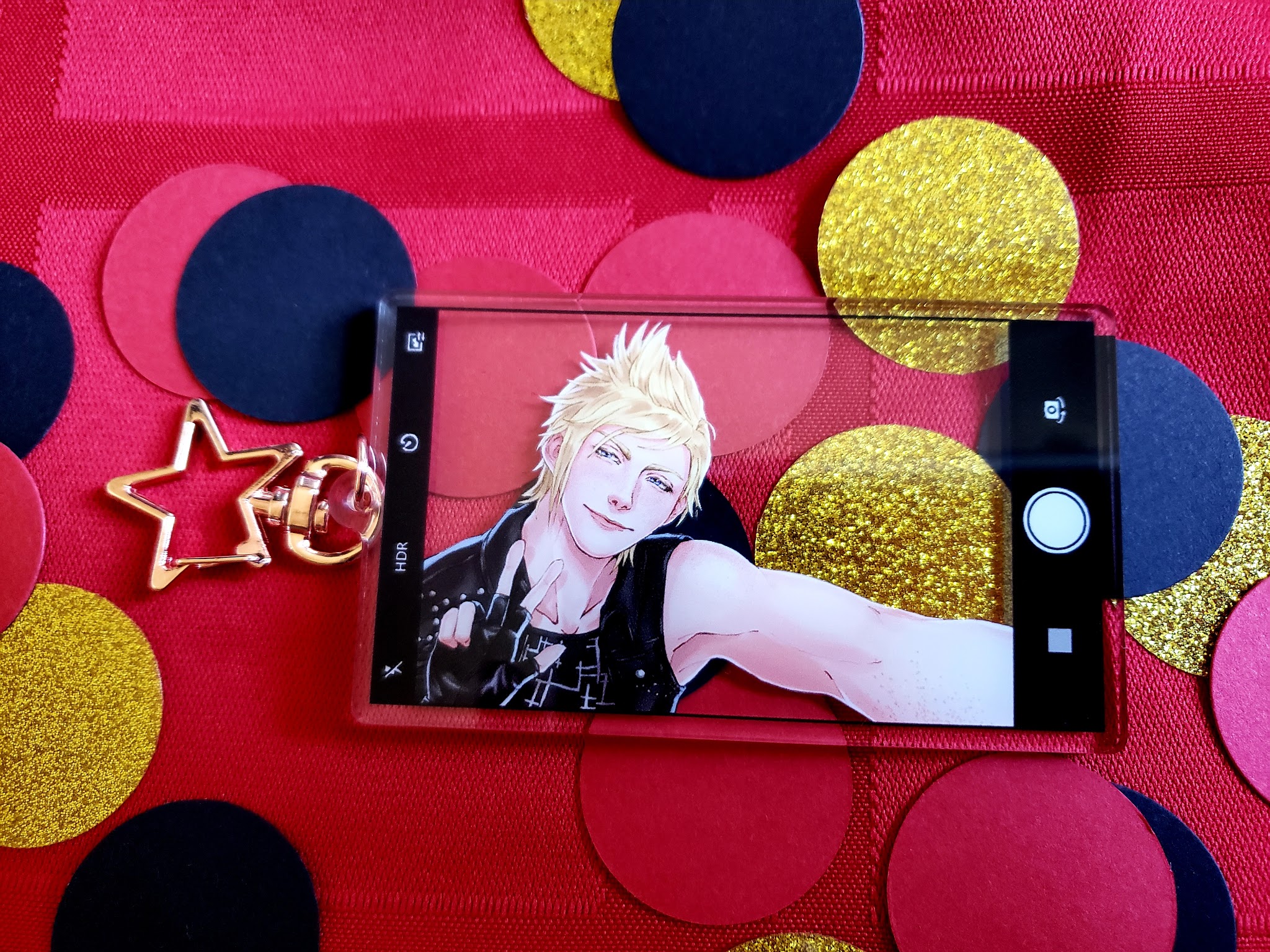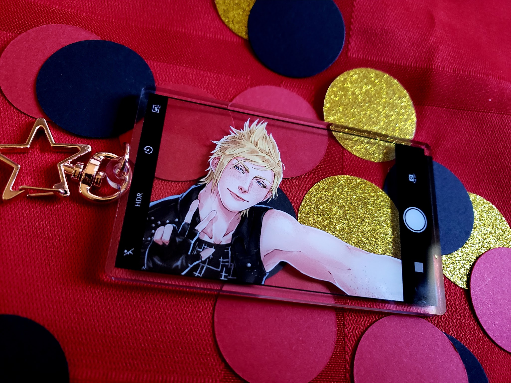 A single sided clear window charm that allows you to compose your own Prompto selfie shots. B-Grade charms have a slight blur around the edges of the printed image.
