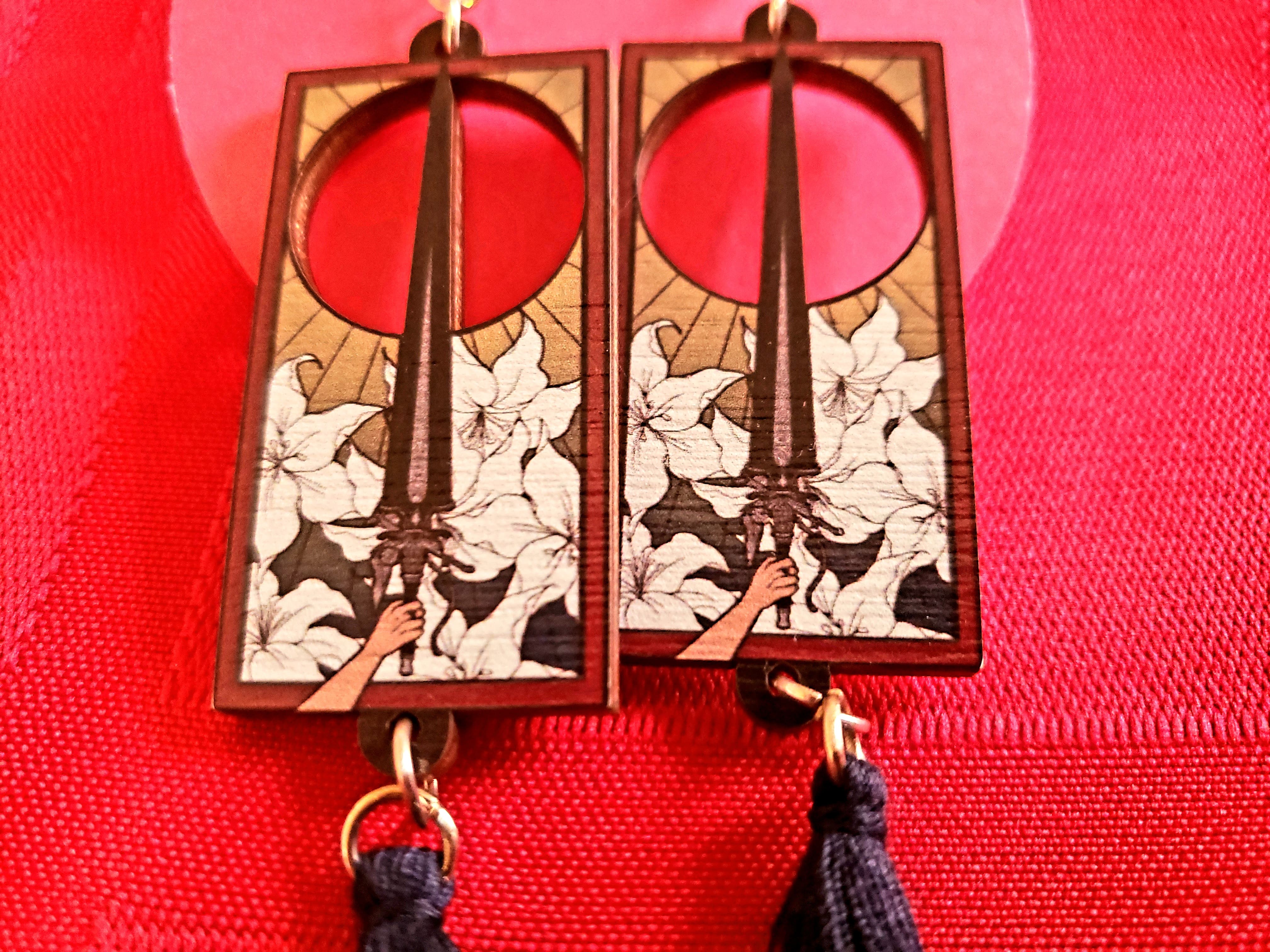 Wooden earrings with Sword of the Father imagery, made with hypoallergenic nickel-free/lead-free metal alloy earring hooks and sustainably sourced birch plywood. Full earring length is approximately 4 inches.