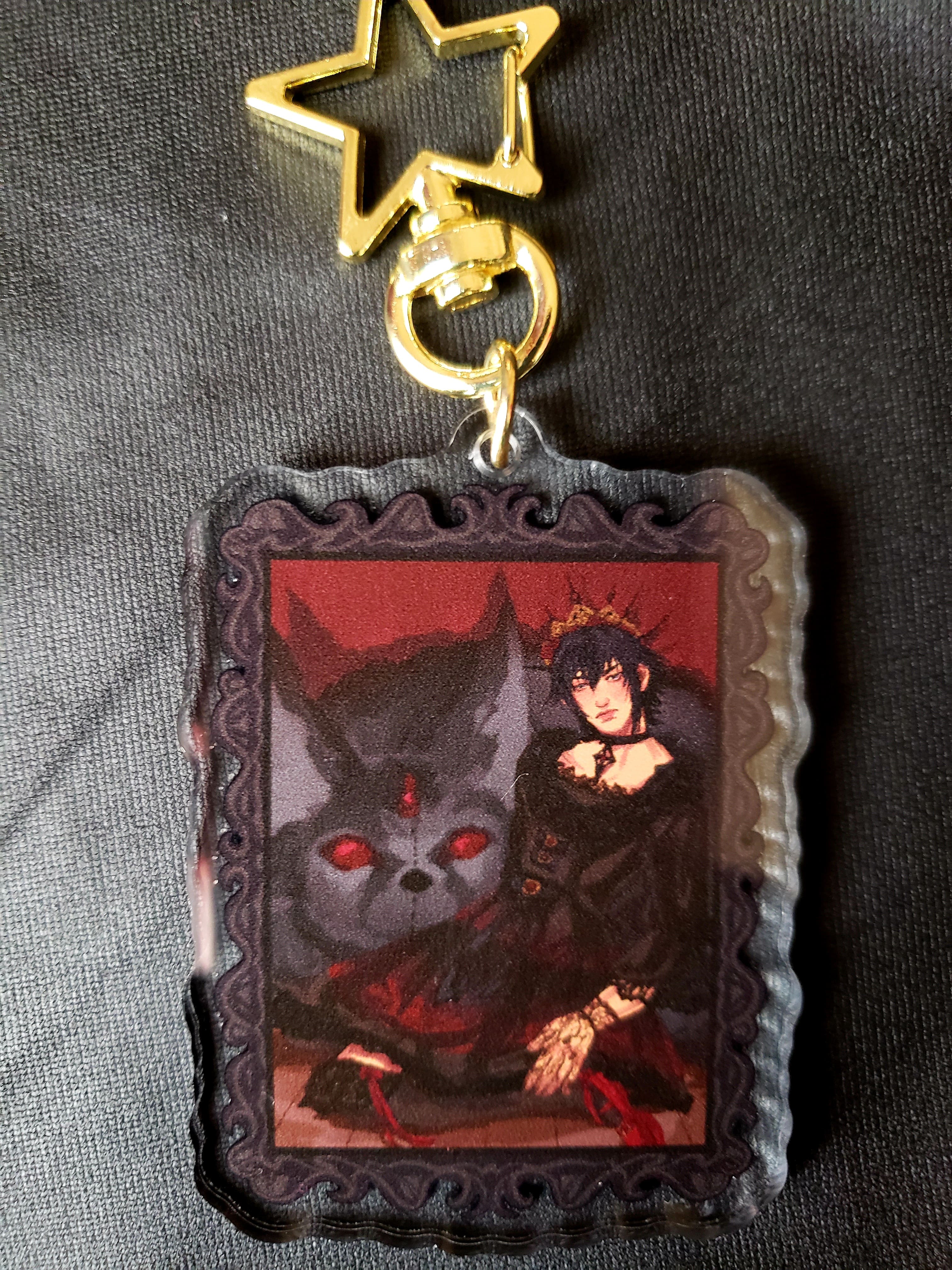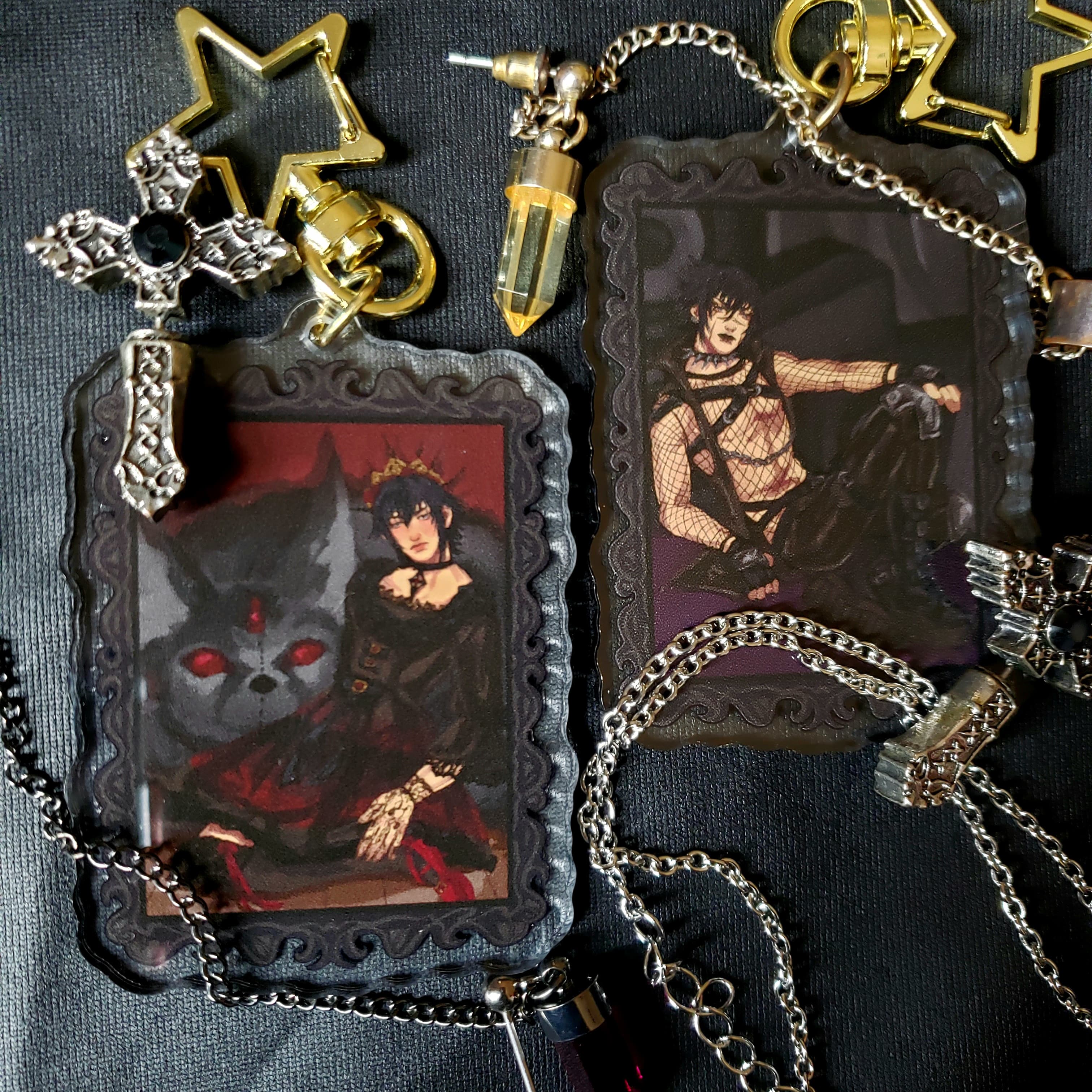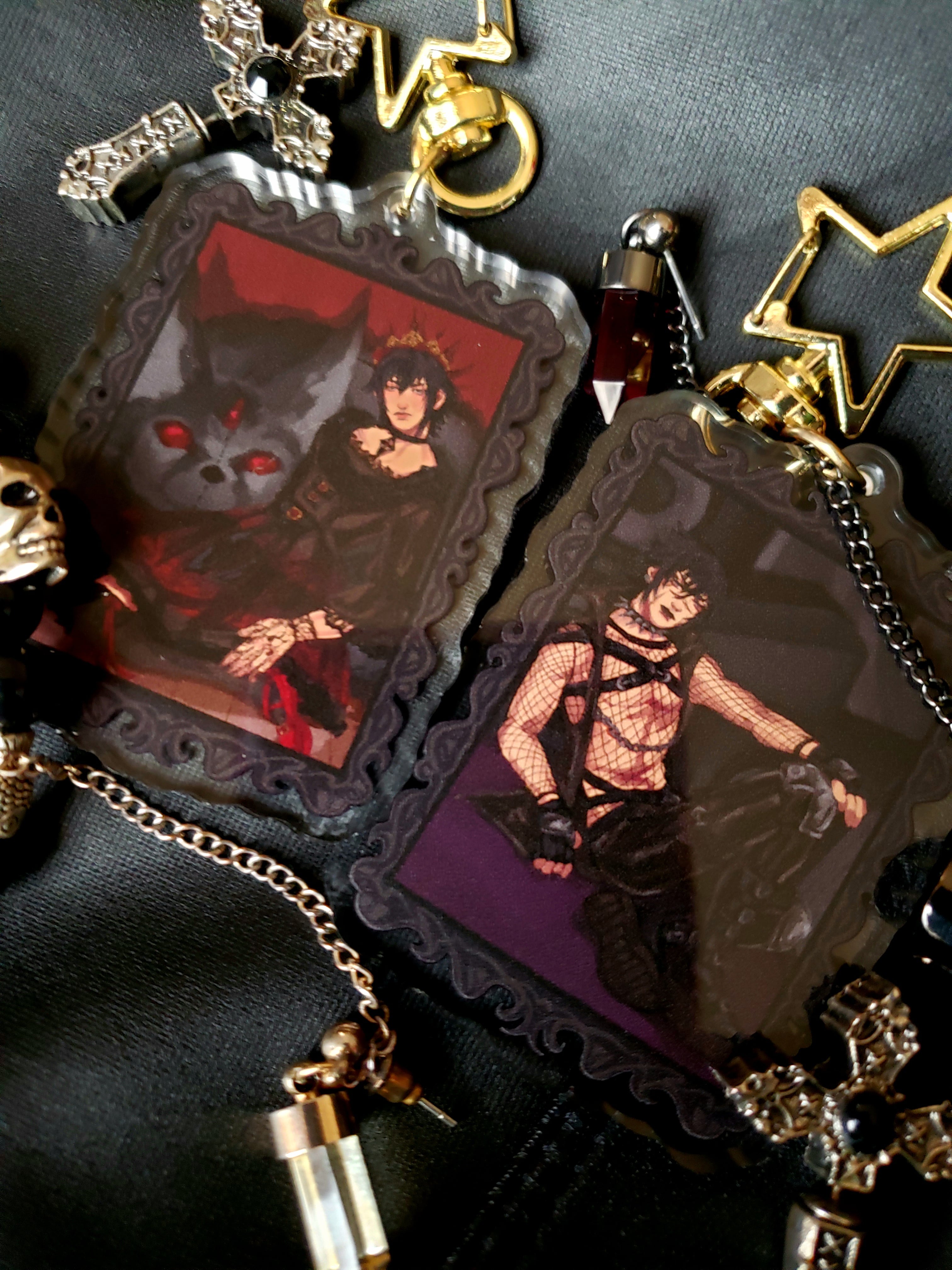 2" double sided acrylic charms featuring Noctis dressed in dark alternative fashion. These are available at a discount due to slight printing errors—the default one is printed accurately but a little dark, and the B-grade is printed brighter but the rear image is backwards.