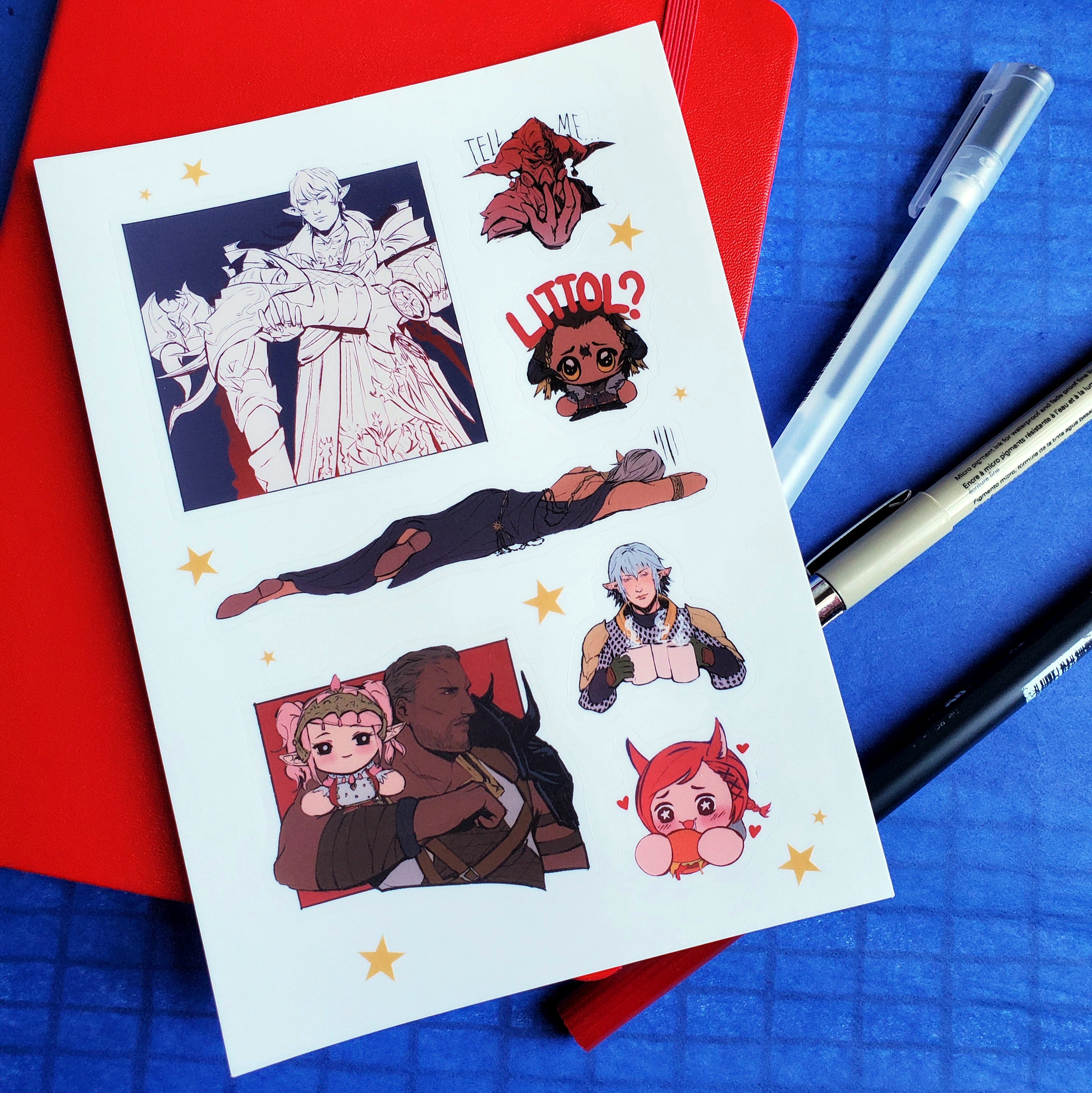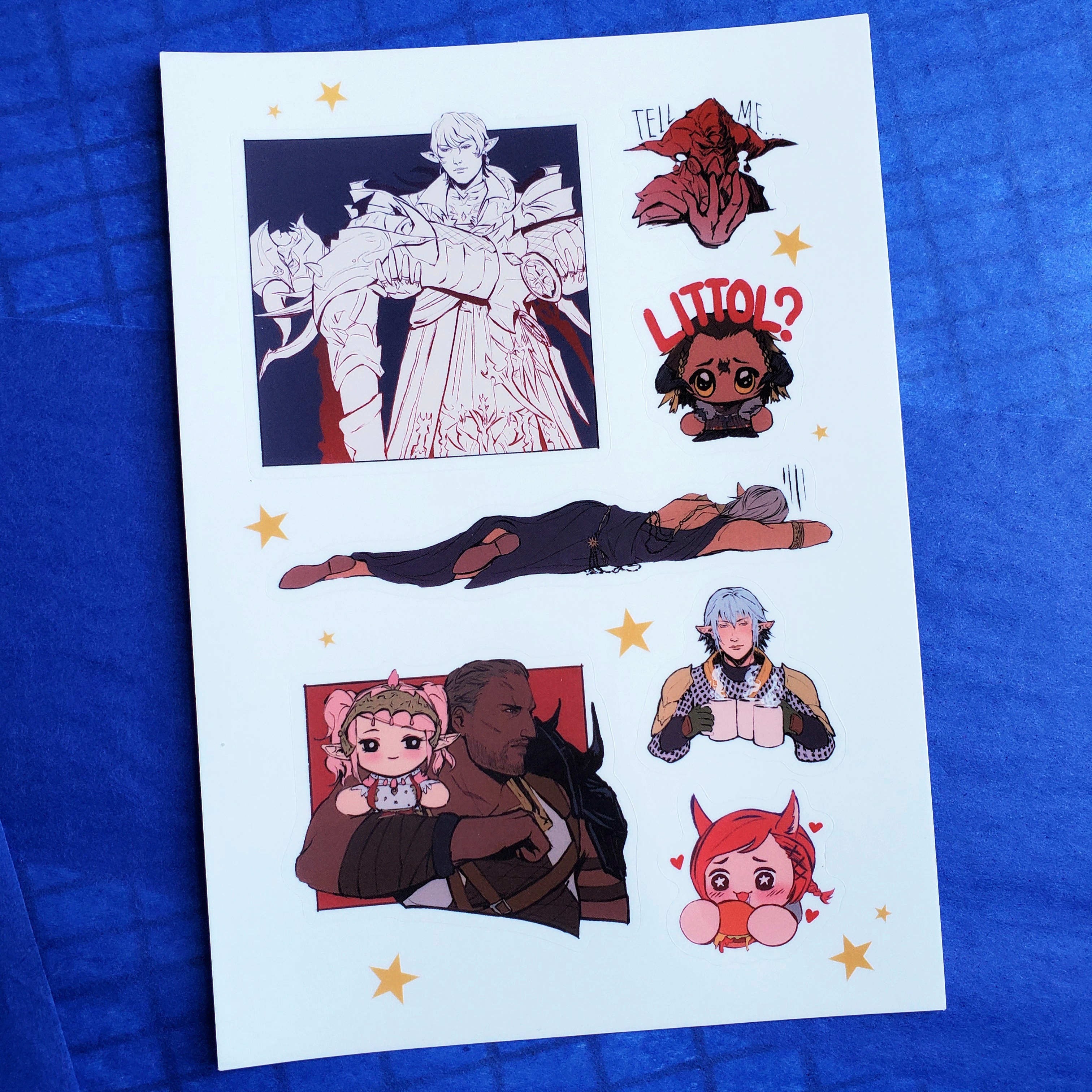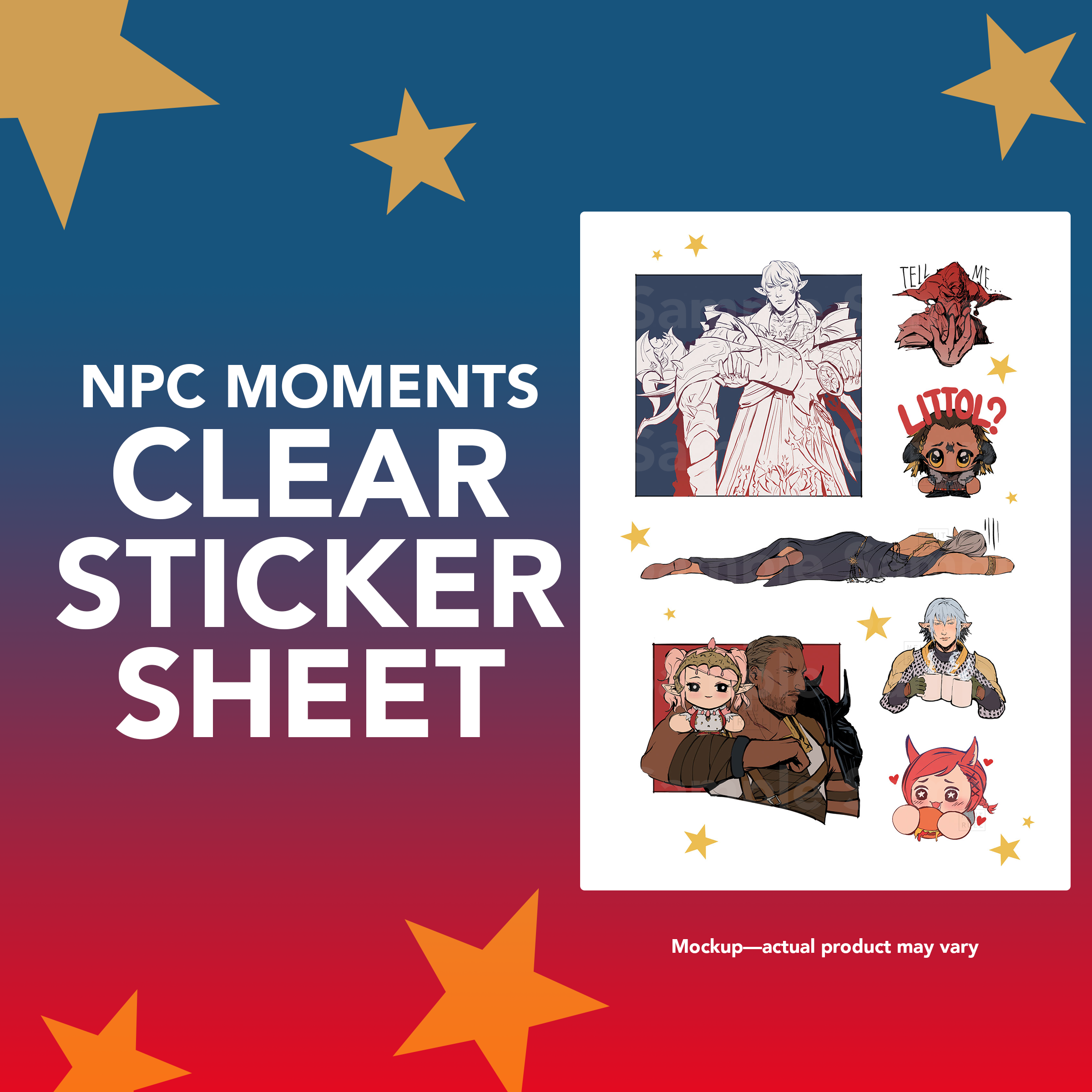 A 5"x7" vinyl sticker sheet featuring several of my favorite NPC moments from the MSQ.