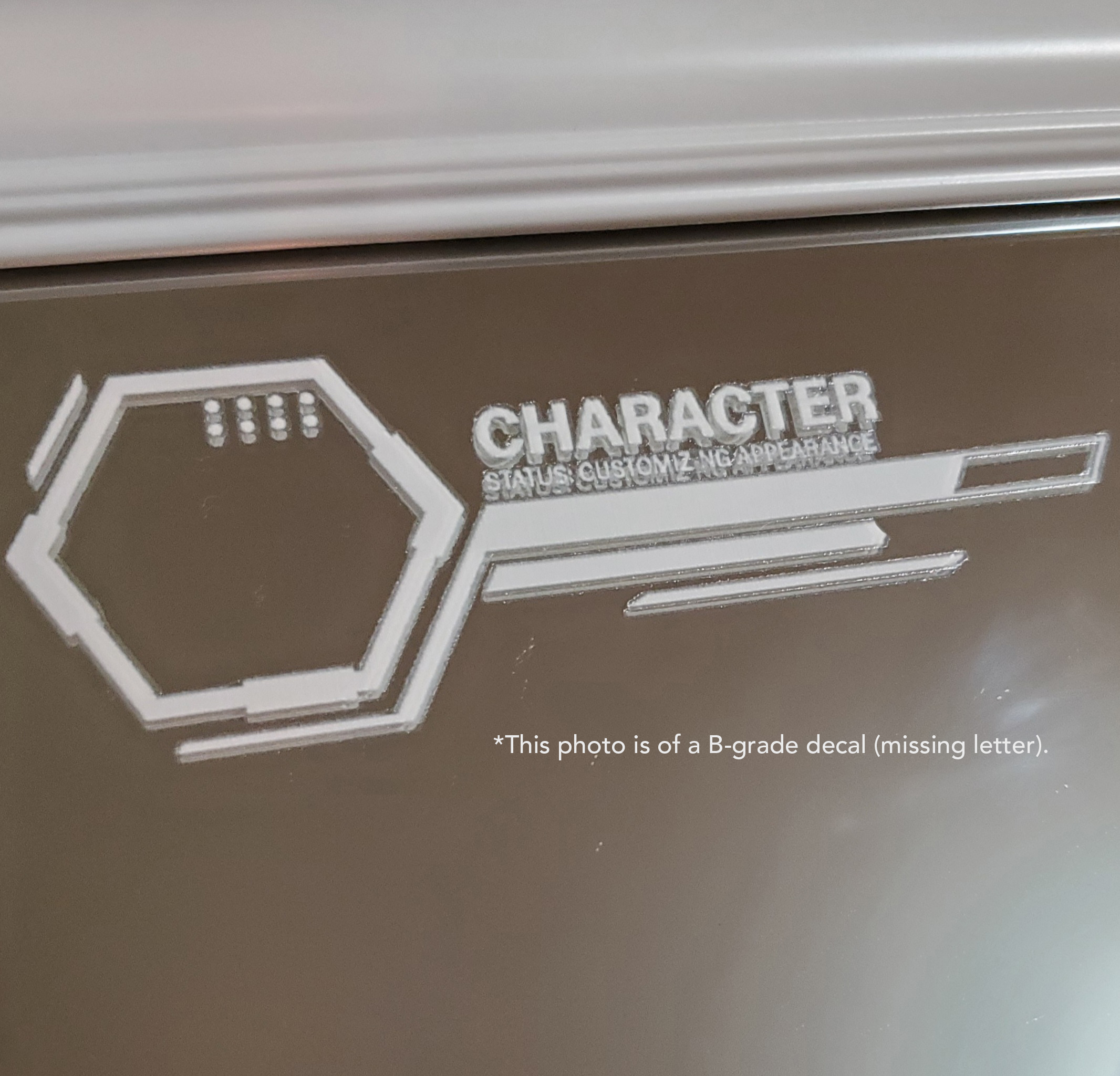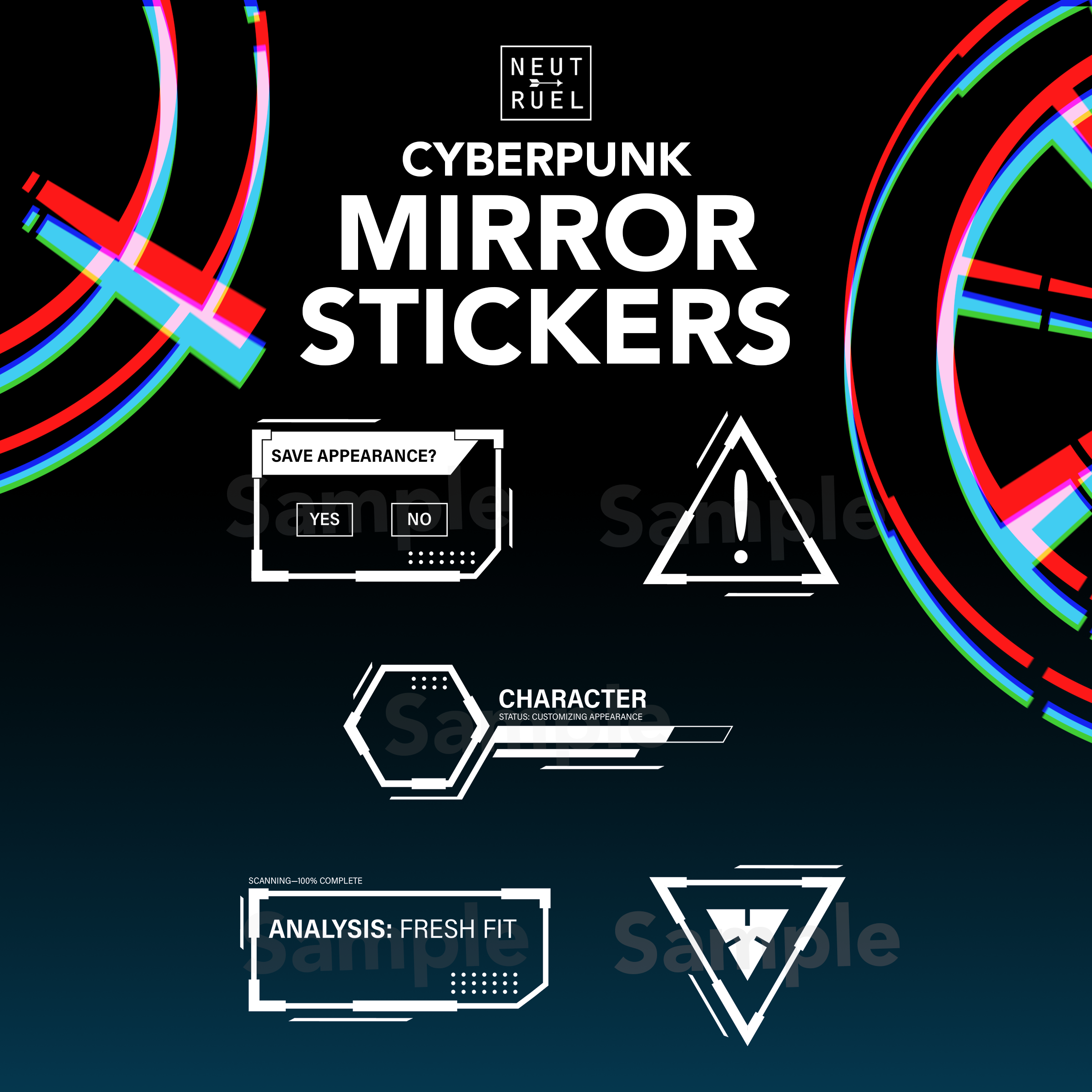 White vinyl decal stickers featuring 5 different cyberpunk-inspired motifs to add a futuristic UI to your mirror. Though these stickers were designed with mirrors in mind, they can adhere to a wide variety of surfaces. Sizes vary from 2" to 5" depending on design.