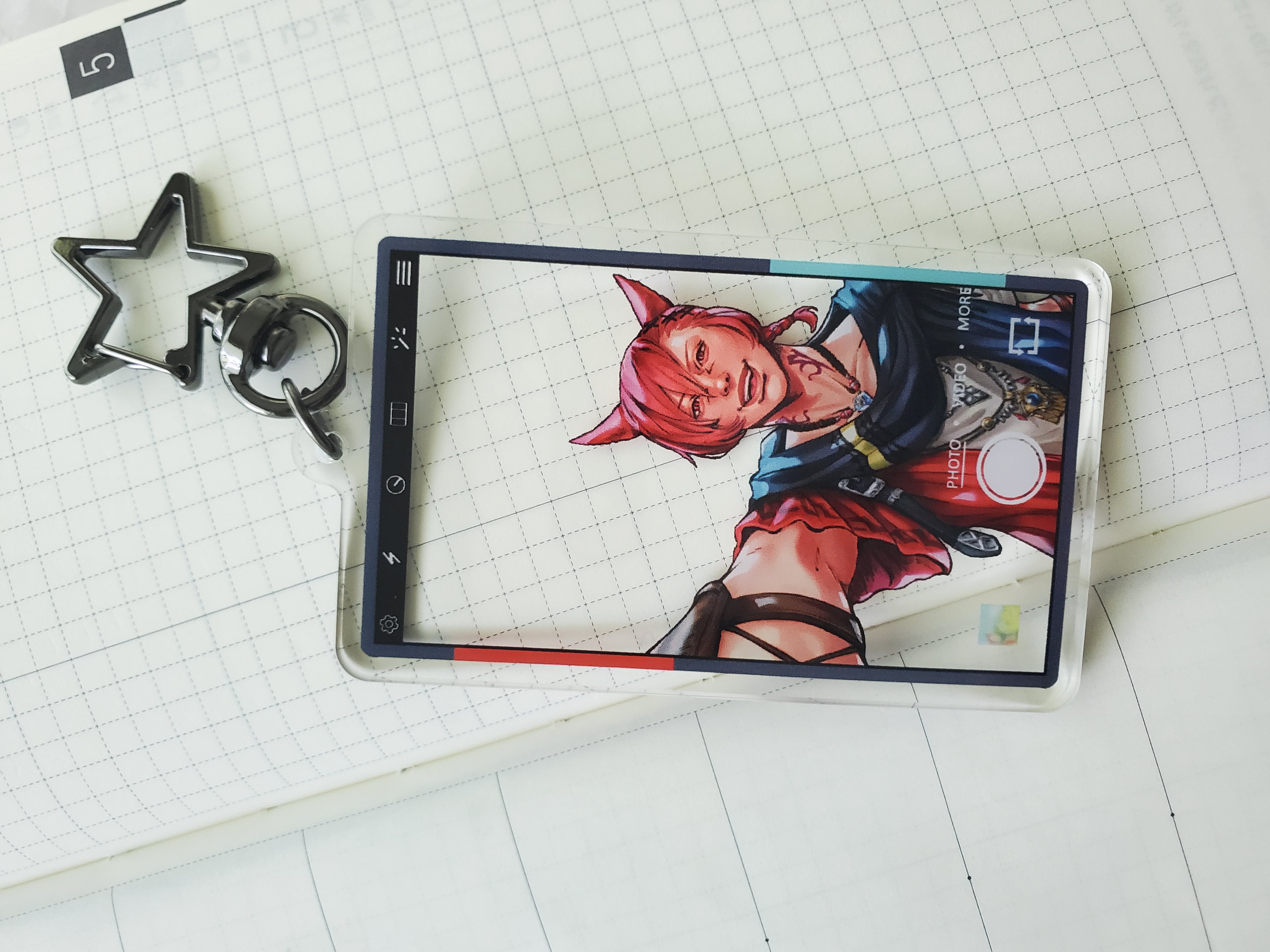 3" acrylic charm featuring G'raha Tia taking a selfie, with a clear window for you to choose his background. Limited stock - leftovers from At Daybreak FFXIV fanzine.